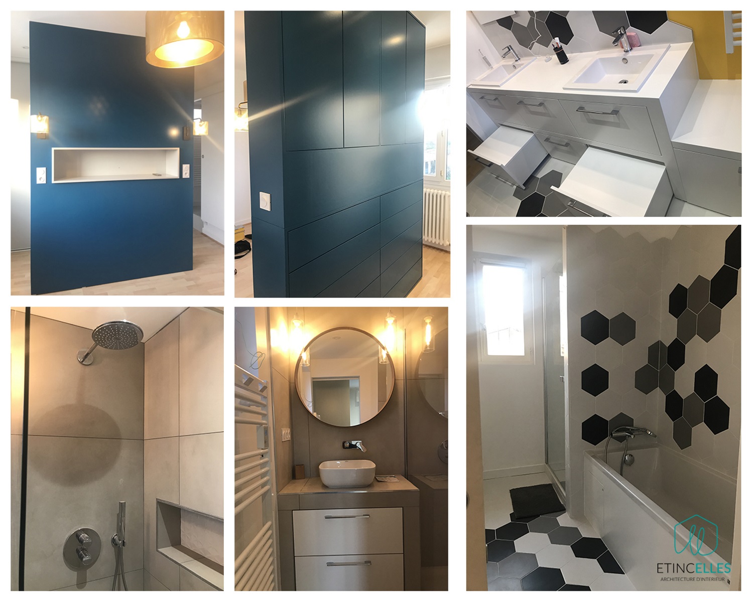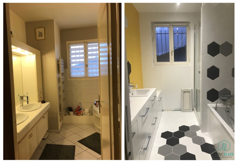 • - Salle de bain dédiée aux enfants en bas âge : Création d’une douche, baignoire, grand meuble vasque, jeux de carreaux hexagonaux noir, blanc, gris, coloris vif au mur. Mobilier sur mesure : vasques avec tiroirs dont 2 Coffres marche-pieds pour un accès facilité aux enfants