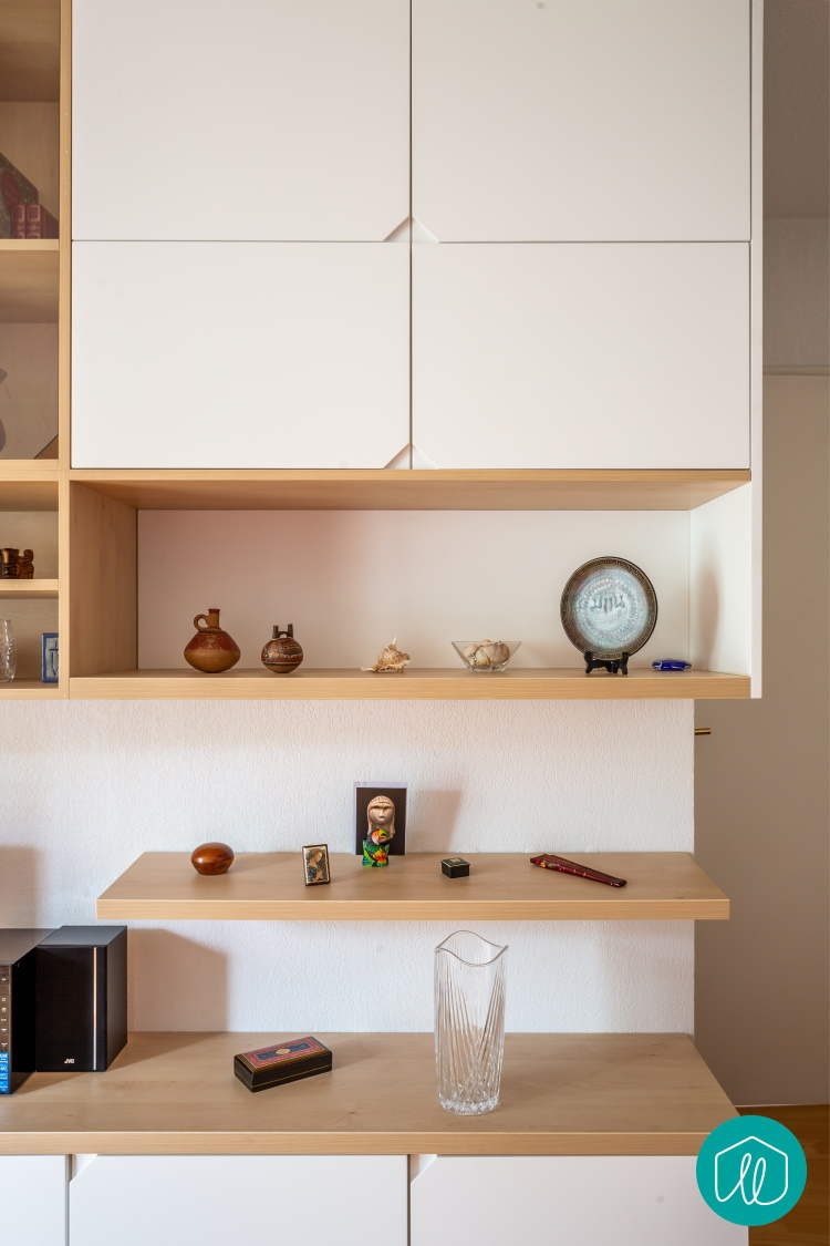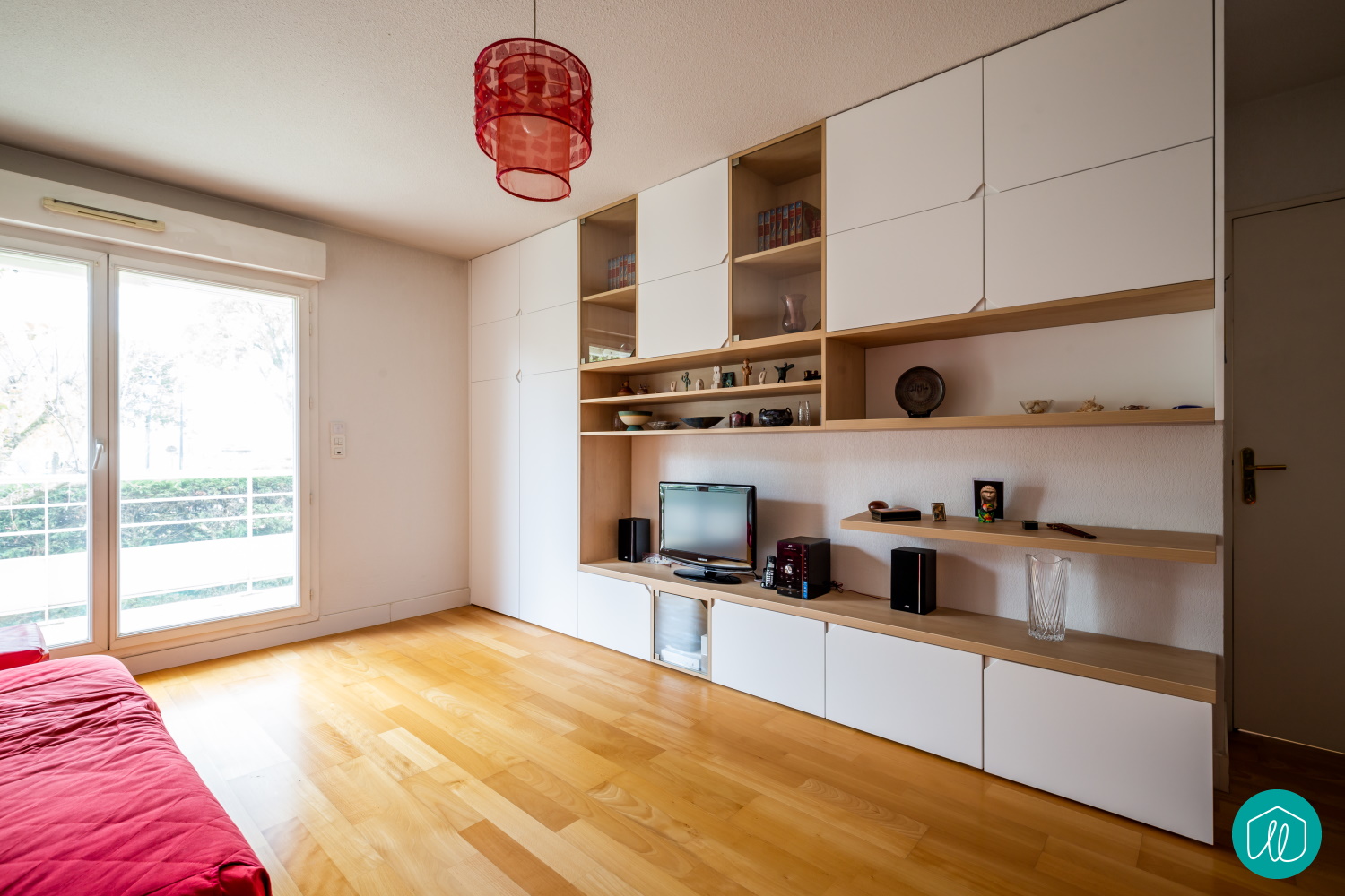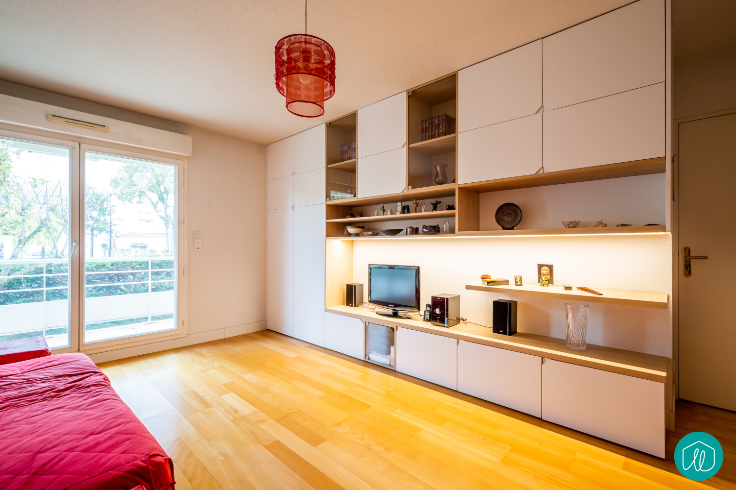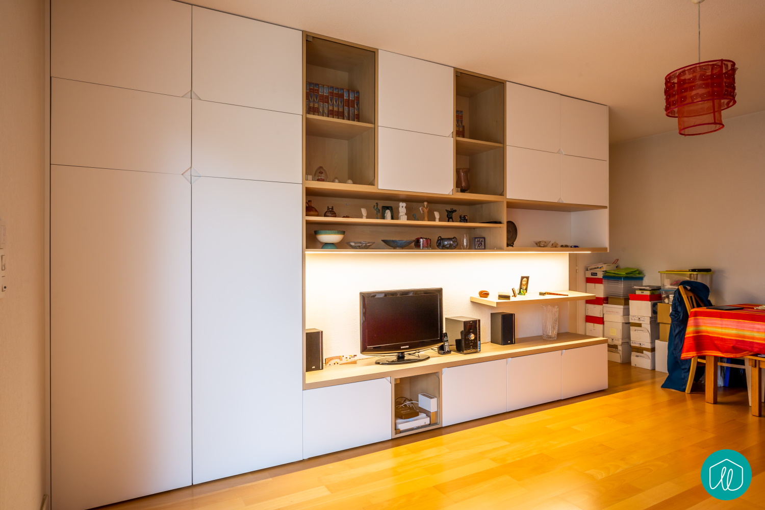 Un salon existant qui manquait de rangement, d’harmonie et de fonctionnalité.