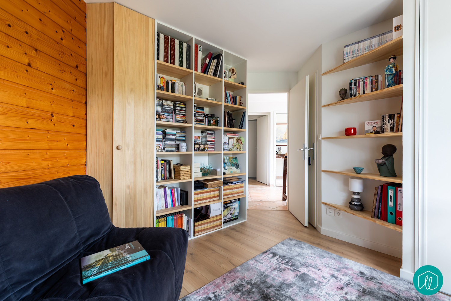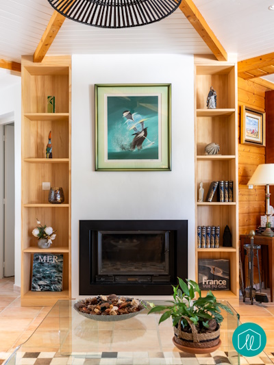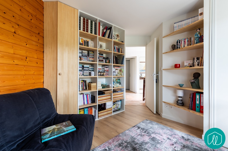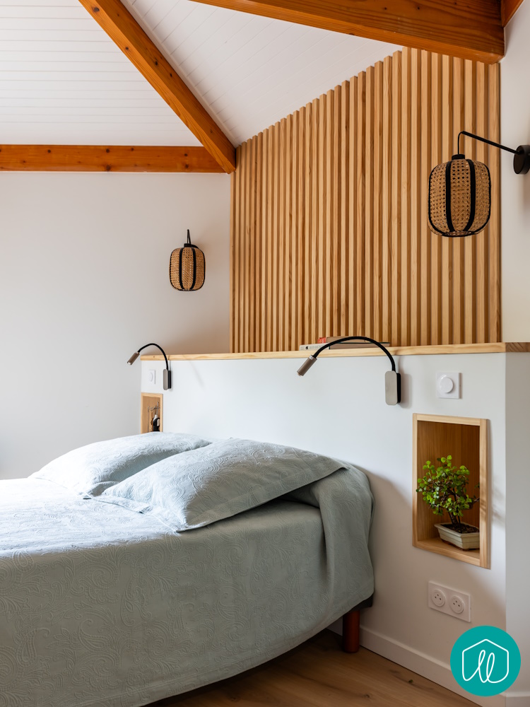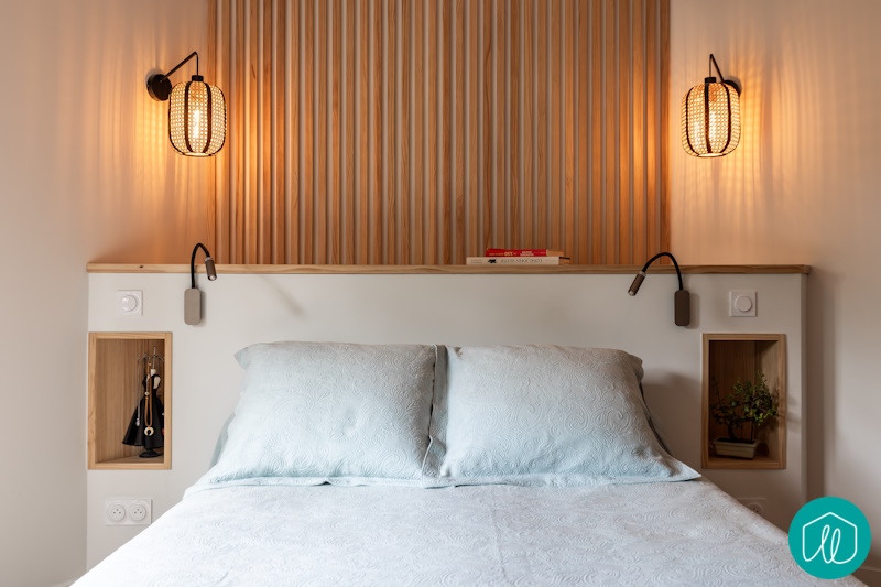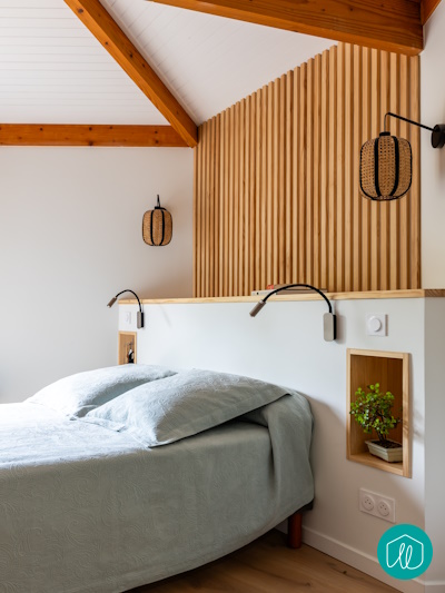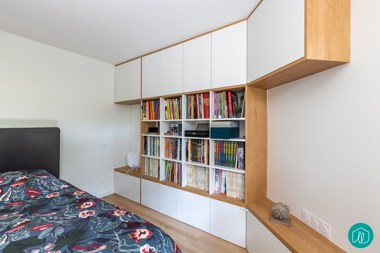 Création d’agencements sur mesure, habillage de la cheminée pour la moderniser, optimisation des chambres avec création de rangements.