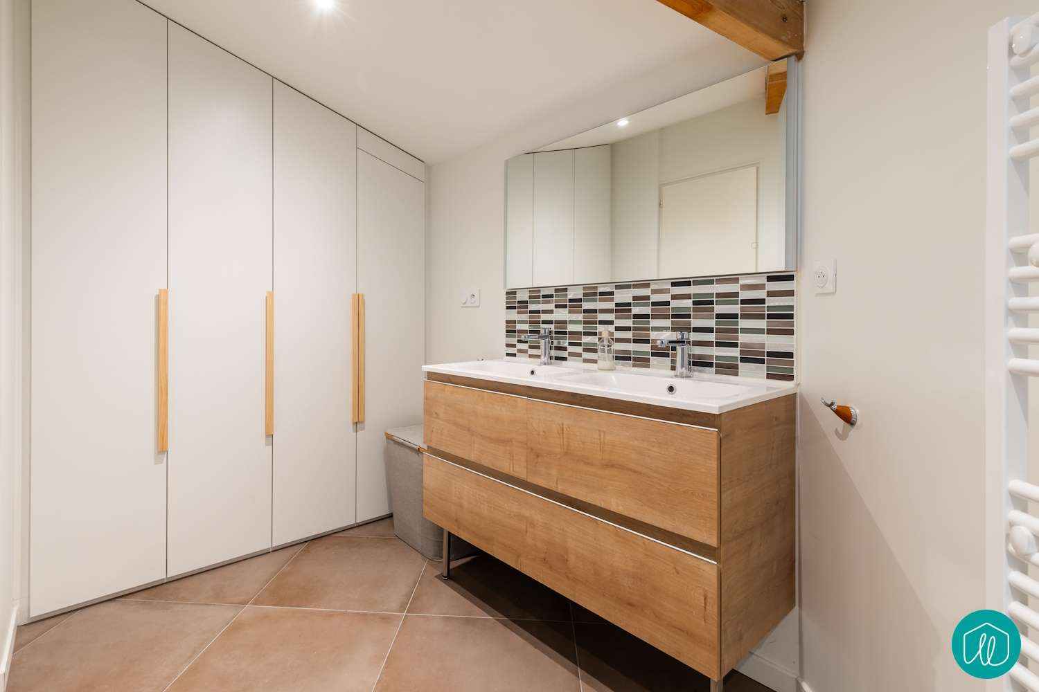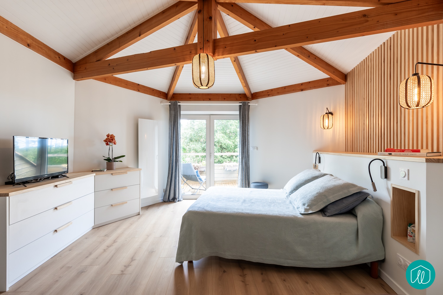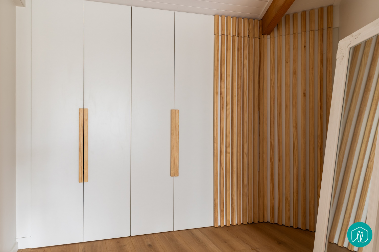 Création d’agencements sur mesure, habillage de la cheminée pour la moderniser, optimisation des chambres avec création de rangements.