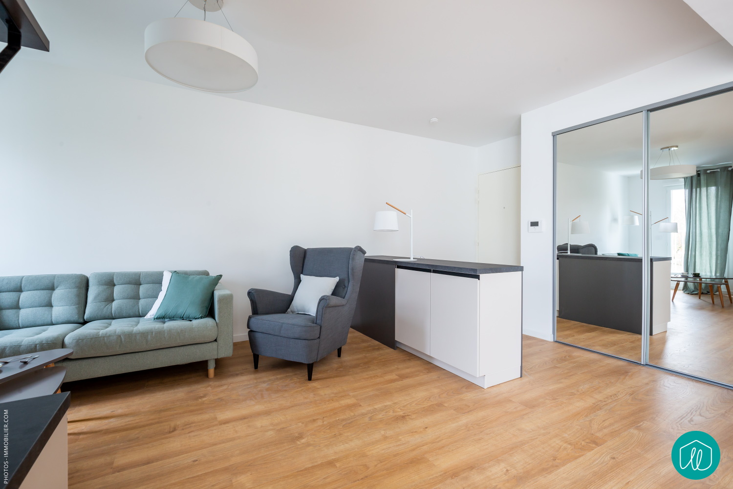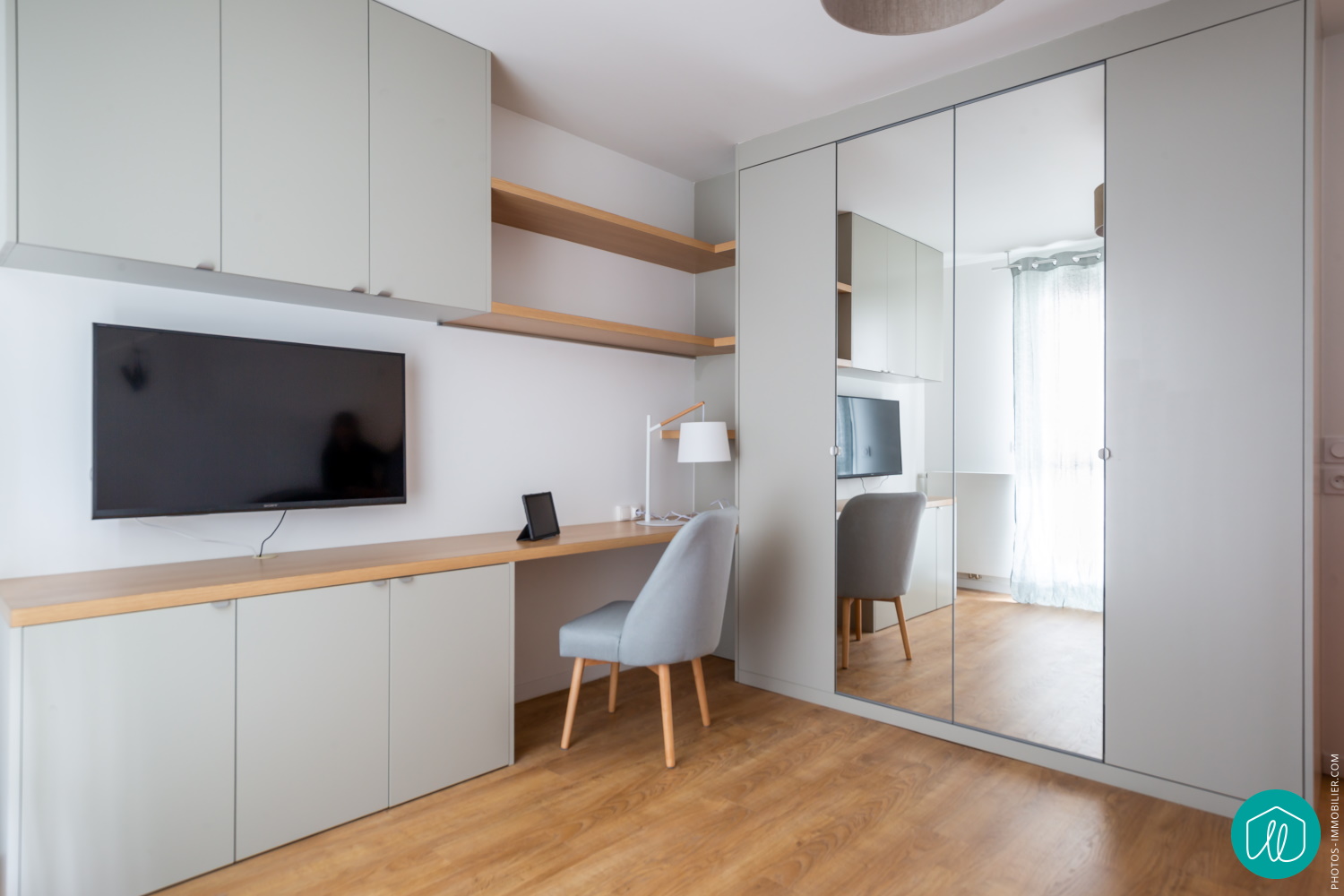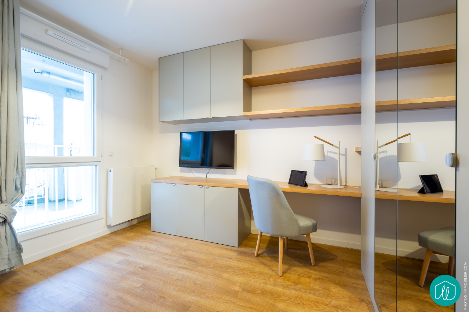 Nécessité de s’approprier les lieux, créer du rangement, une cuisine équipée, un coin bureau et dressing dans la chambre, meubler et décorer l’appartement.