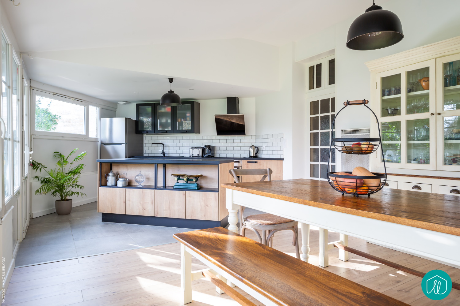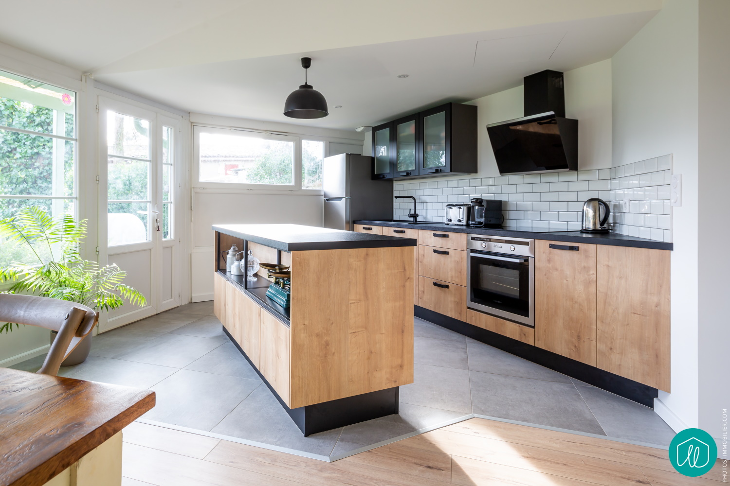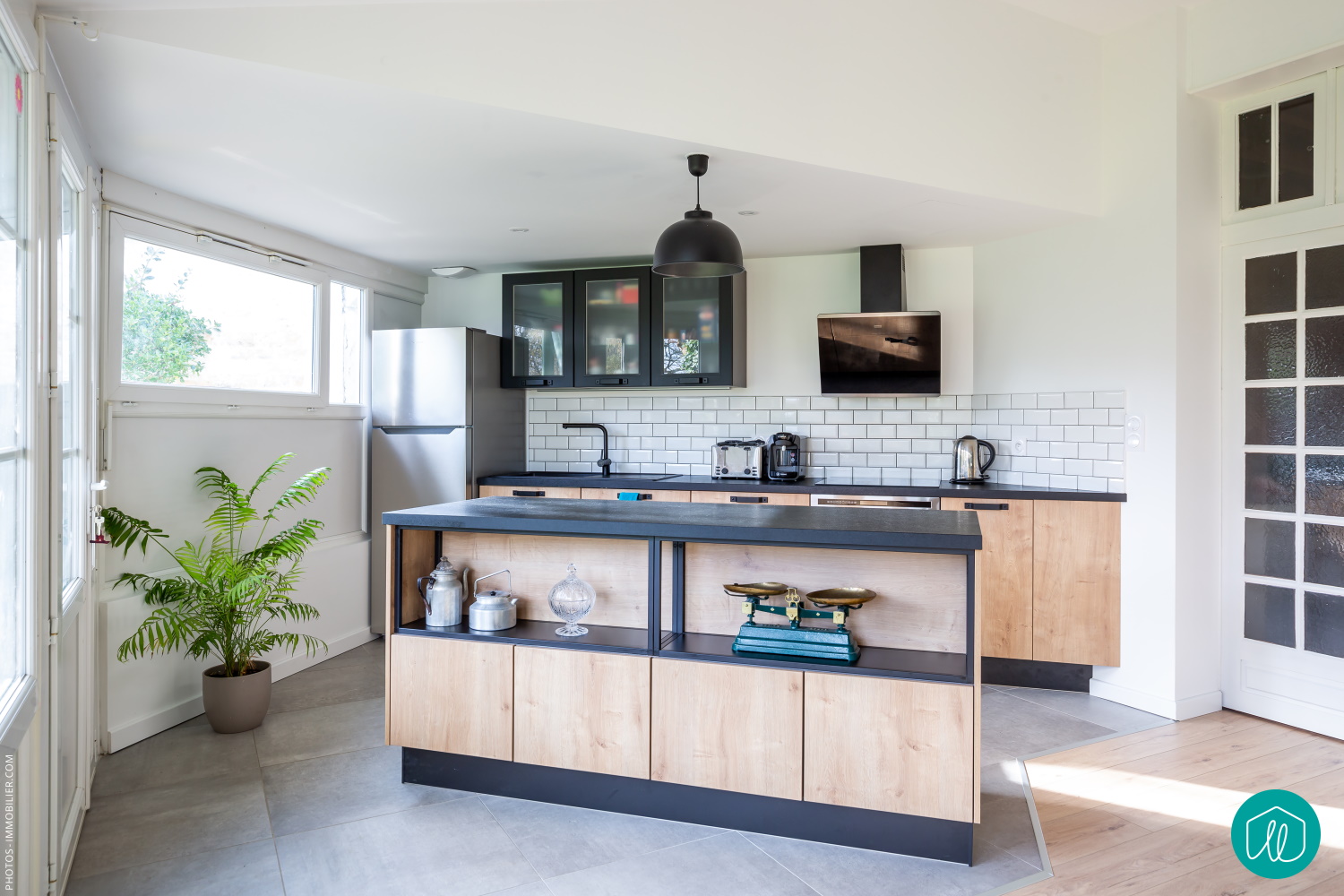Agrandir la cuisine, la rendre fonctionnelle, optimiser et lui donner un style industriel/végétal. Apporter une ambiance cosy, lumineuse. L’objectif était d’allier les matières brutes à une tonalité végétale et reposante.