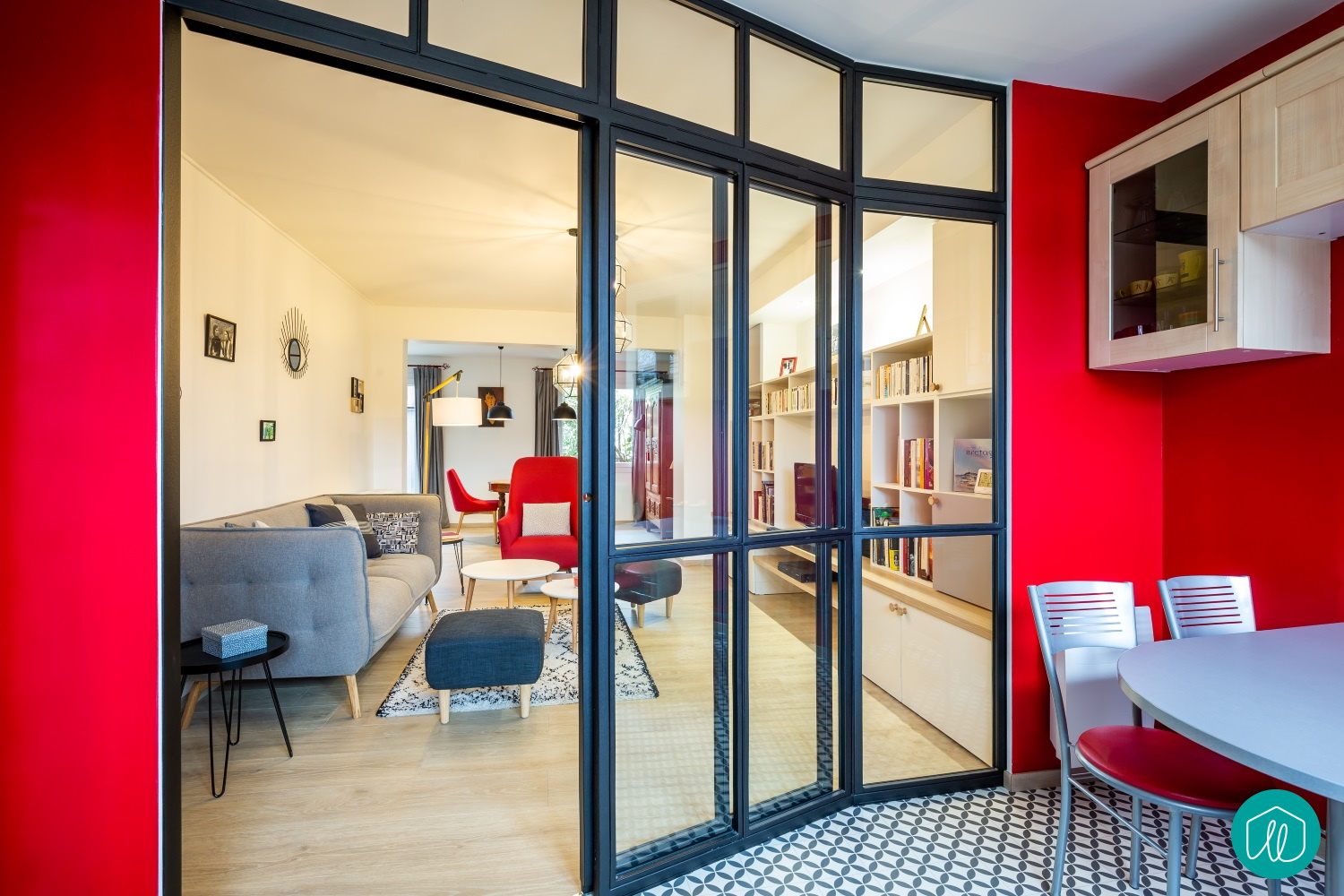 Les clients avaient déjà rénové leur cuisine et adoraient le rouge qu’ils avaient choisi. Nous avons pris le parti d’apporter des touches de rouge dans la nouvelle décoration.